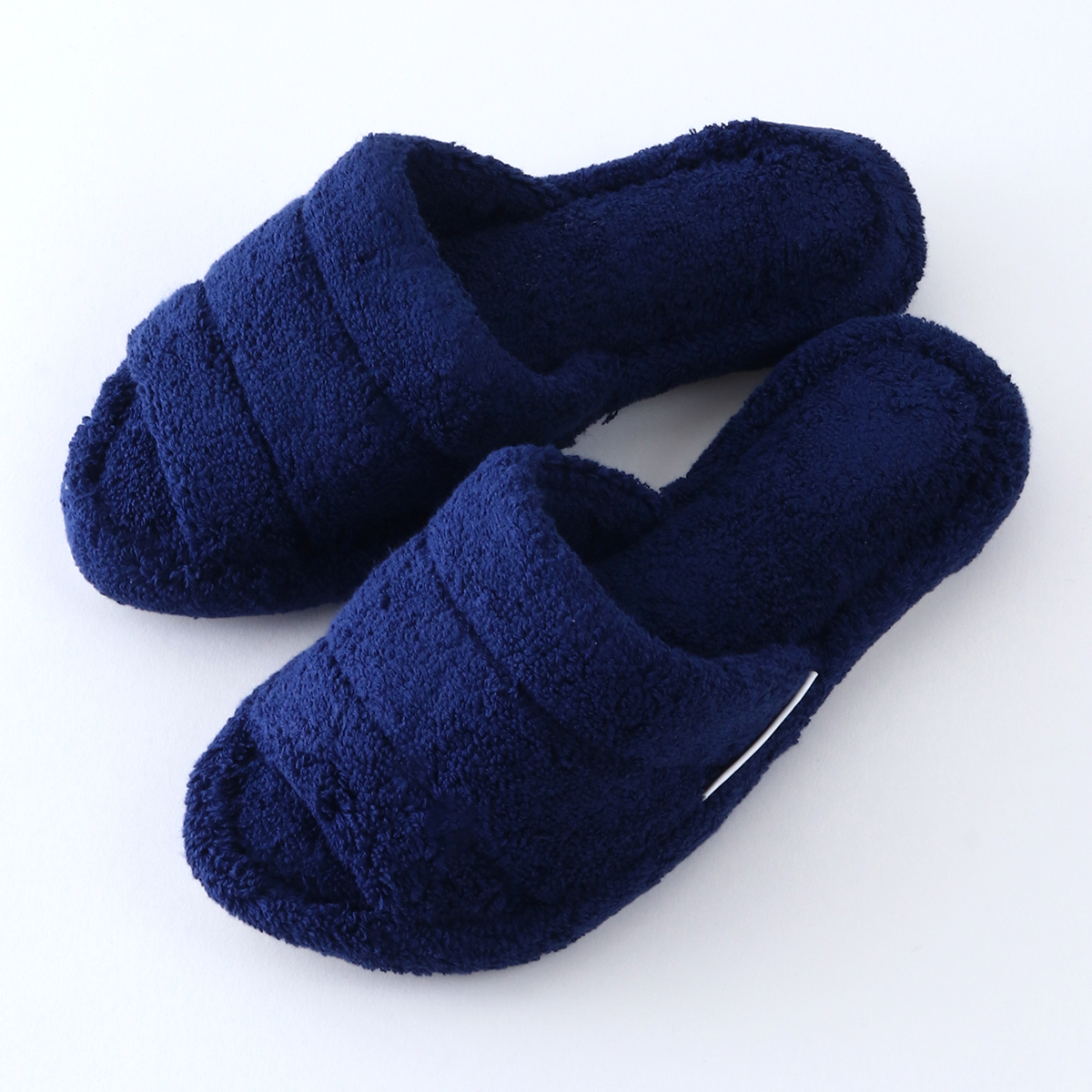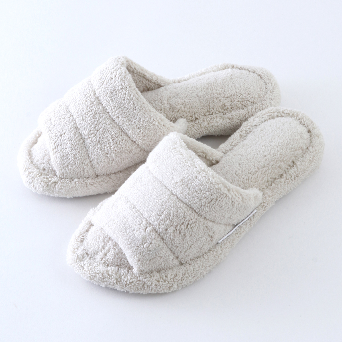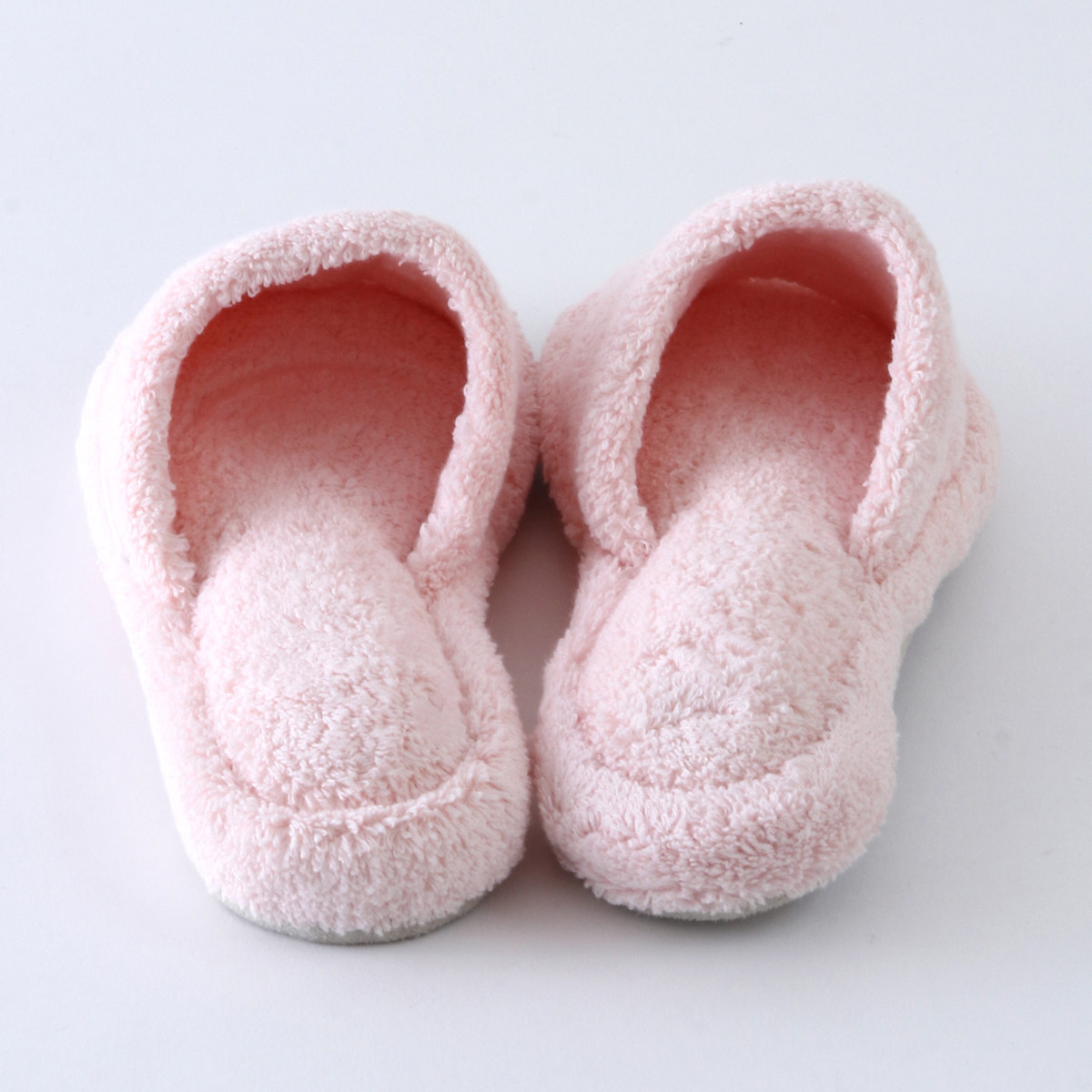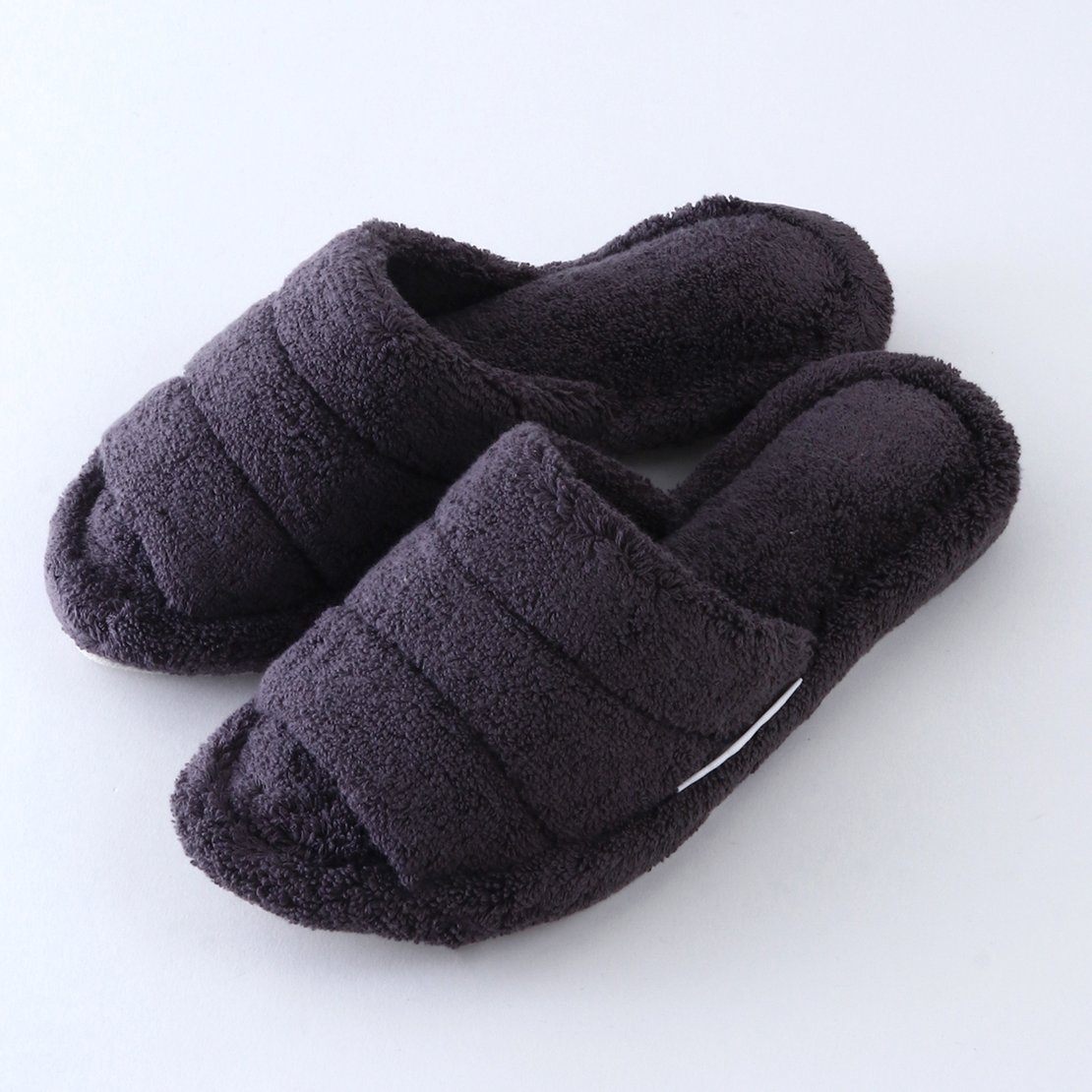 It is made of voluminous towel fabric that feels comfortable on bare feet. Since it is not a thong type, you can wear it even with socks on. The shoes are made of terry cloth and have a thick, sturdy heel that makes walking quieter.