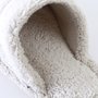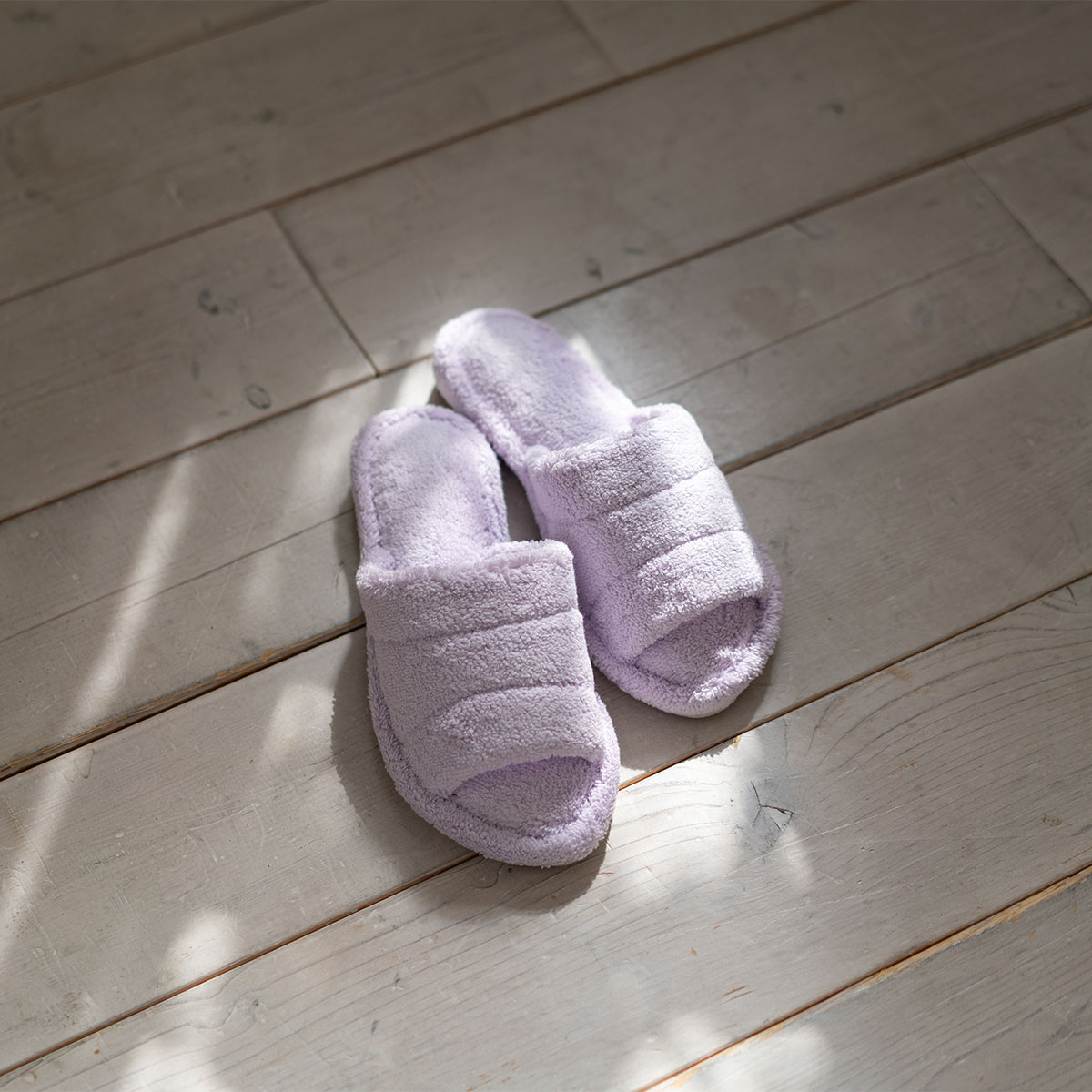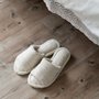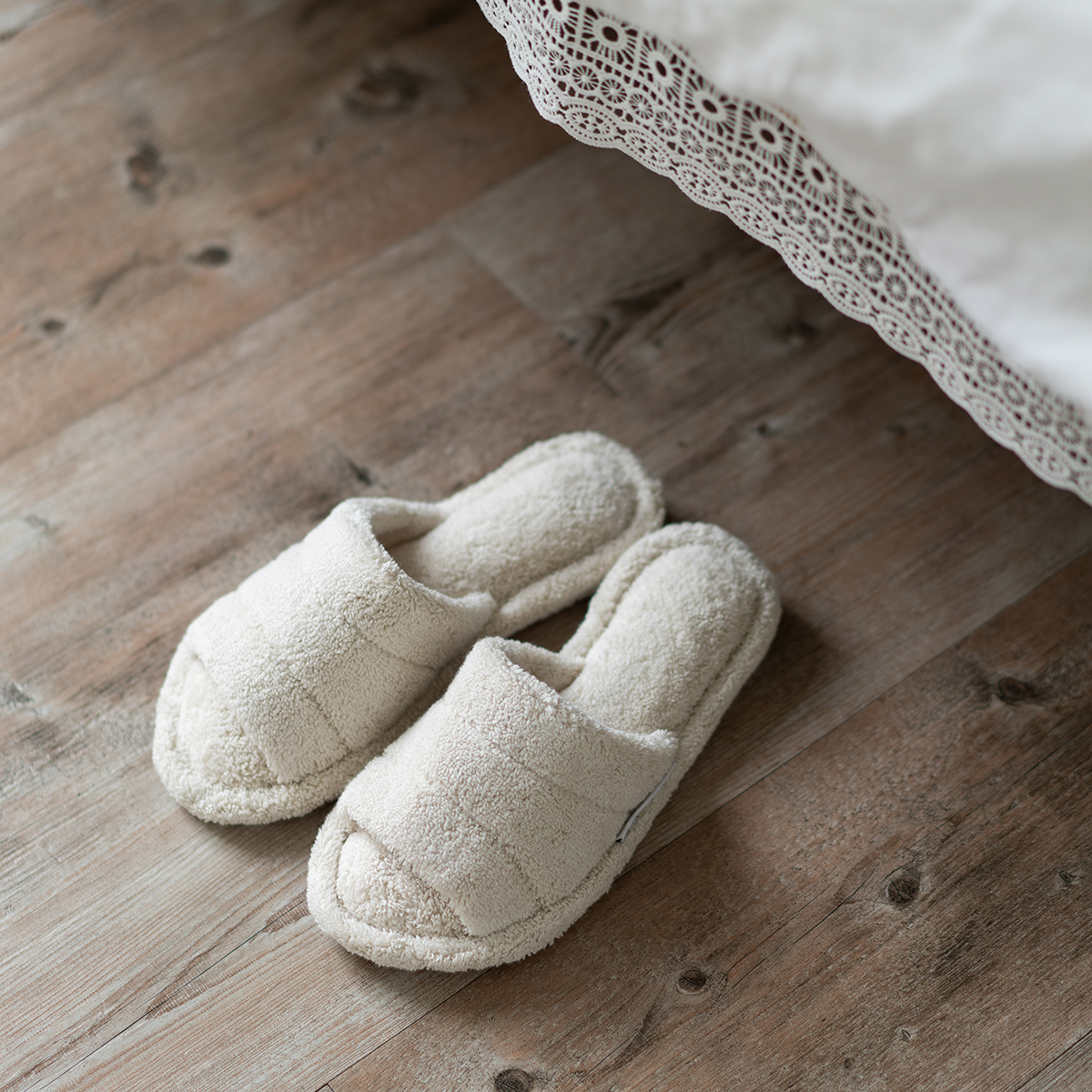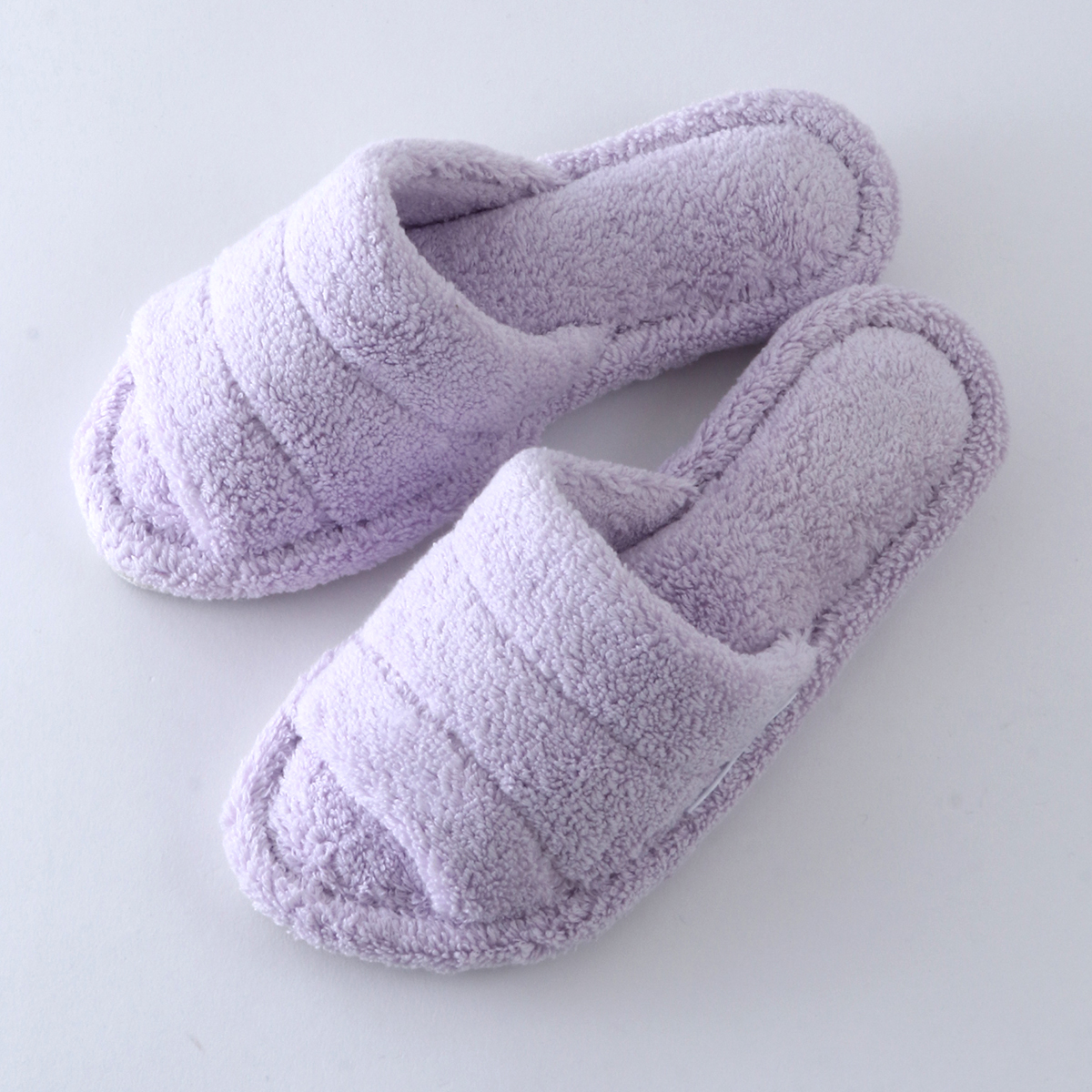 It is made of voluminous towel fabric that feels comfortable on bare feet. Since it is not a thong type, you can wear it even with socks on. The shoes are made of terry cloth and have a thick, sturdy heel that makes walking quieter.