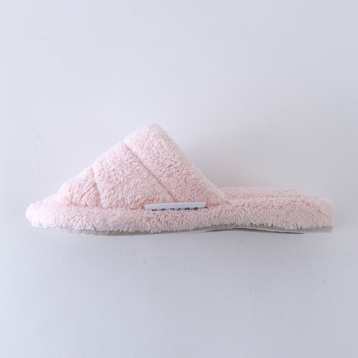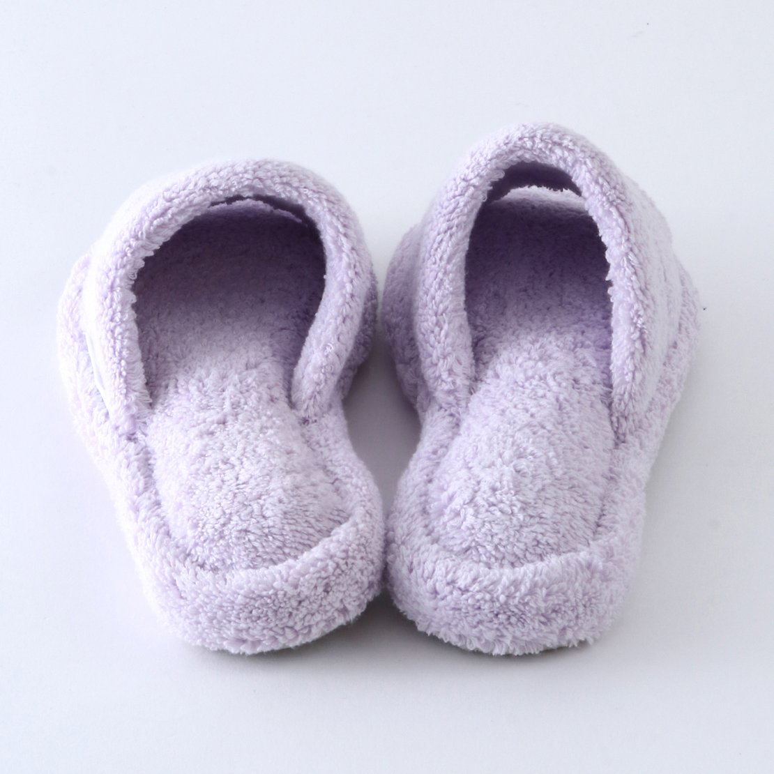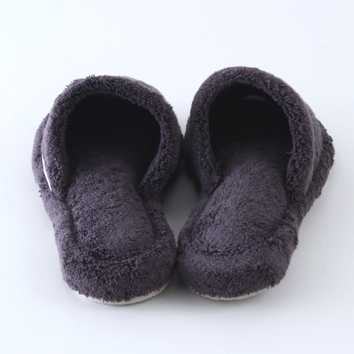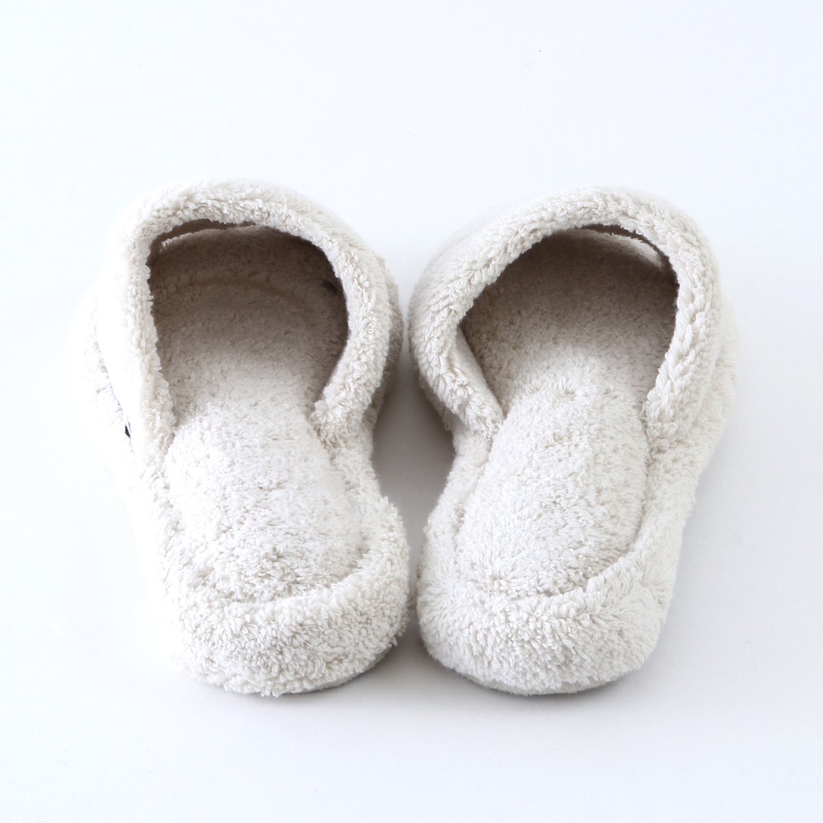 It is made of voluminous towel fabric that feels comfortable on bare feet. Since it is not a thong type, you can wear it even with socks on. The shoes are made of terry cloth and have a thick, sturdy heel that makes walking quieter.