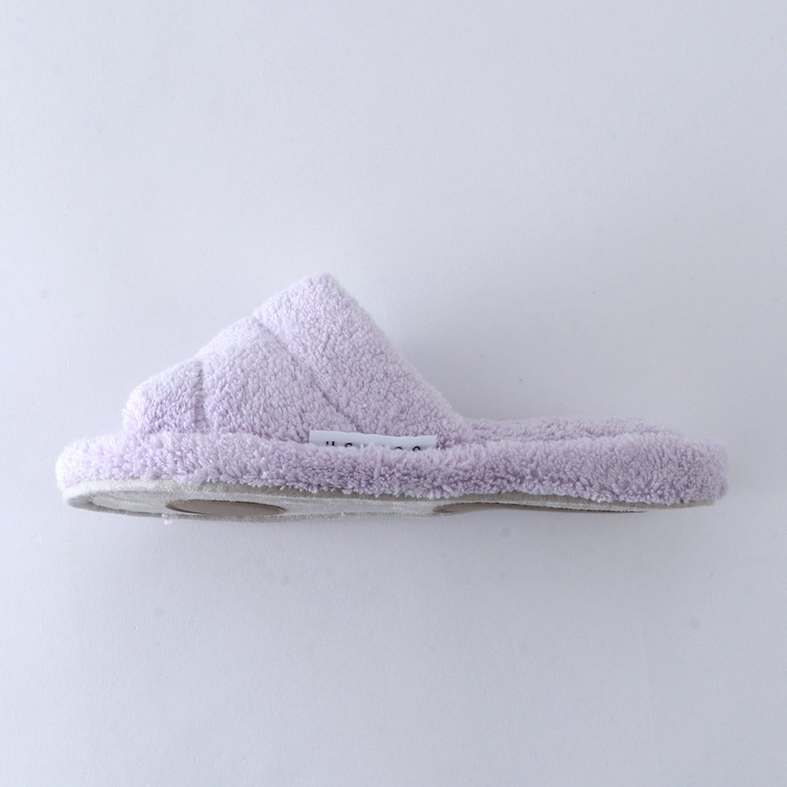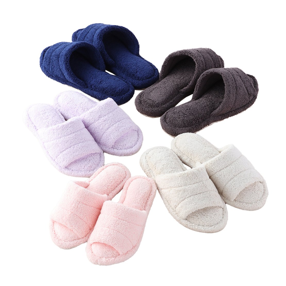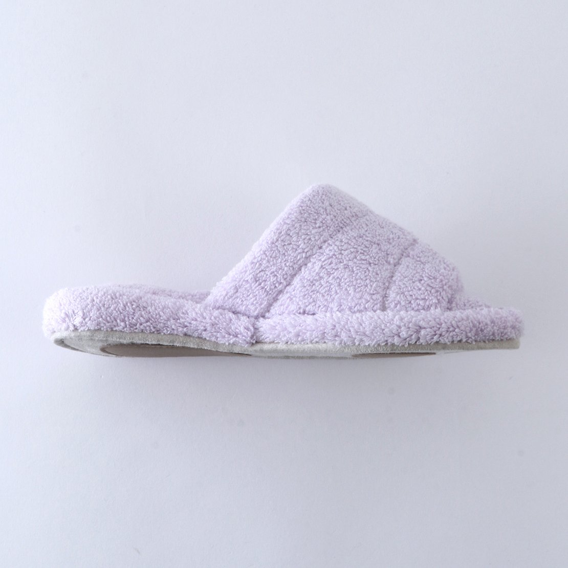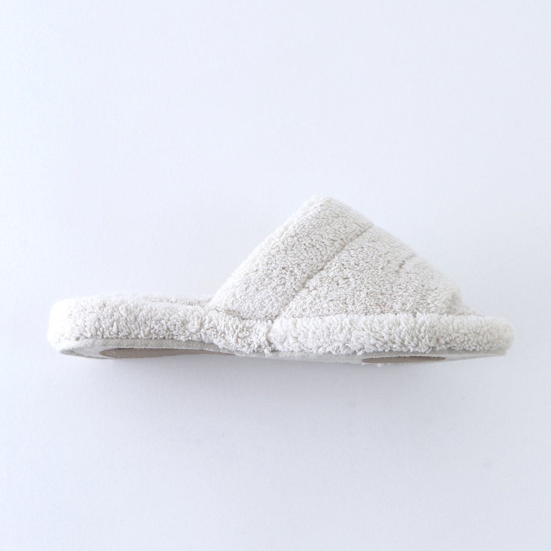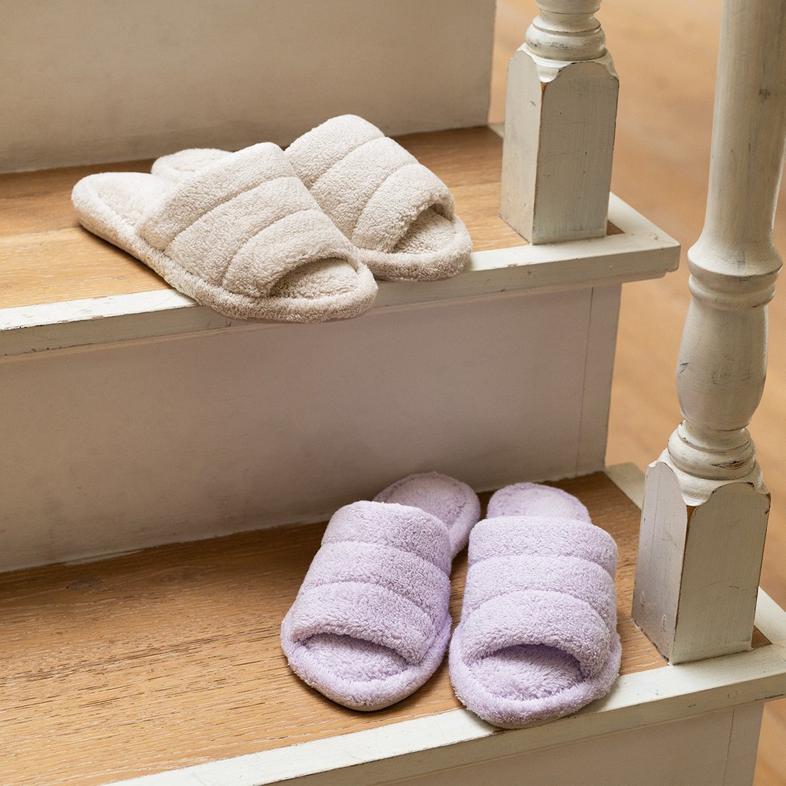 It is made of voluminous towel fabric that feels comfortable on bare feet. Since it is not a thong type, you can wear it even with socks on. The shoes are made of terry cloth and have a thick, sturdy heel that makes walking quieter.
