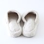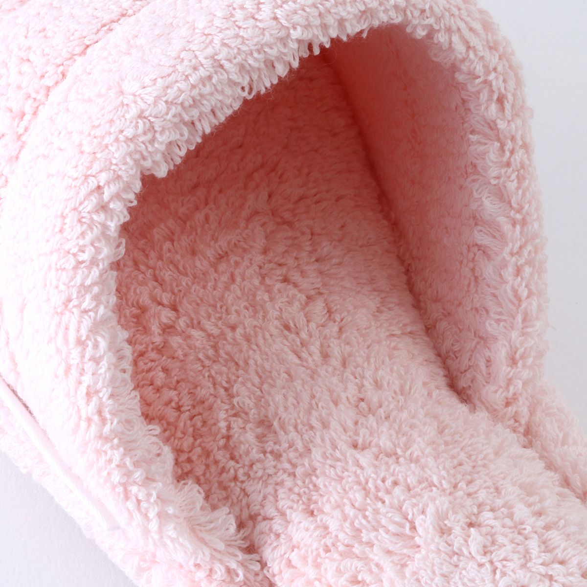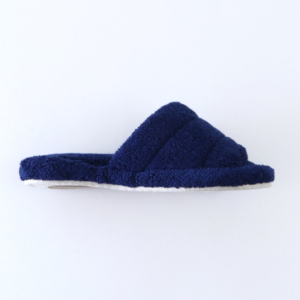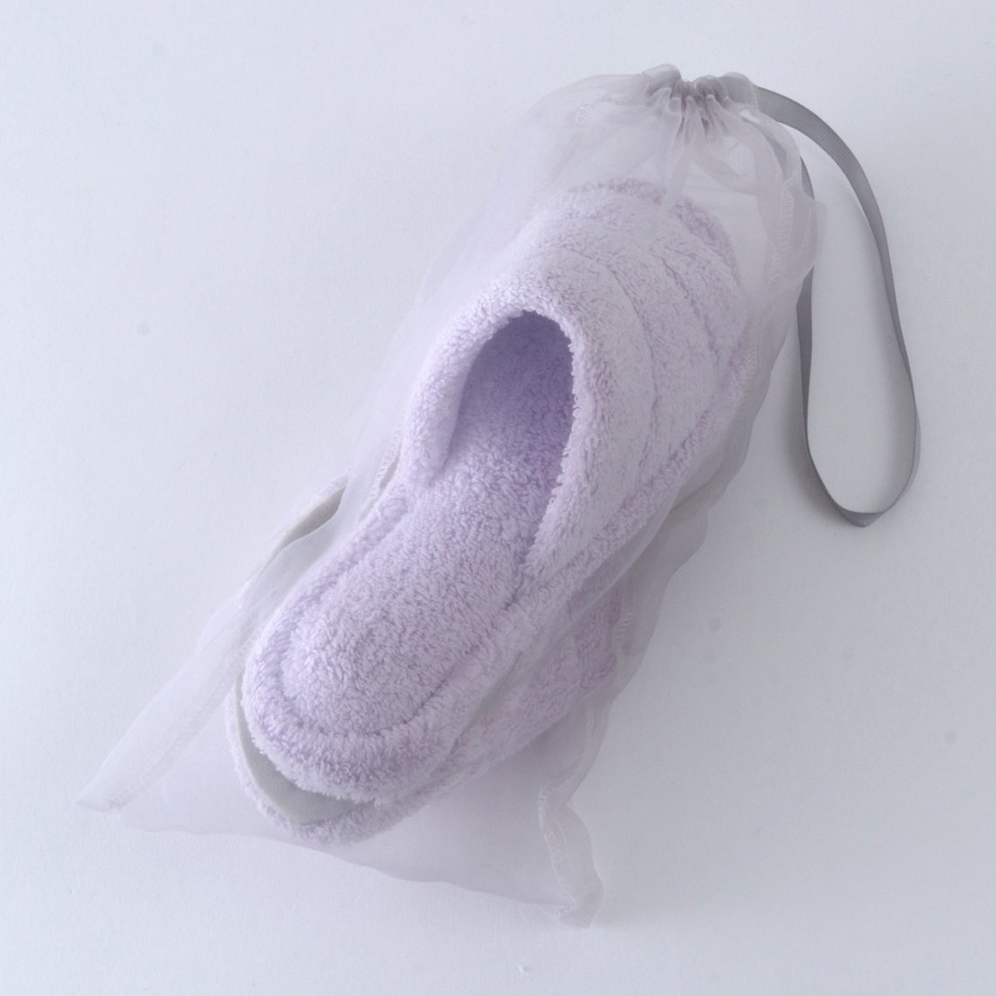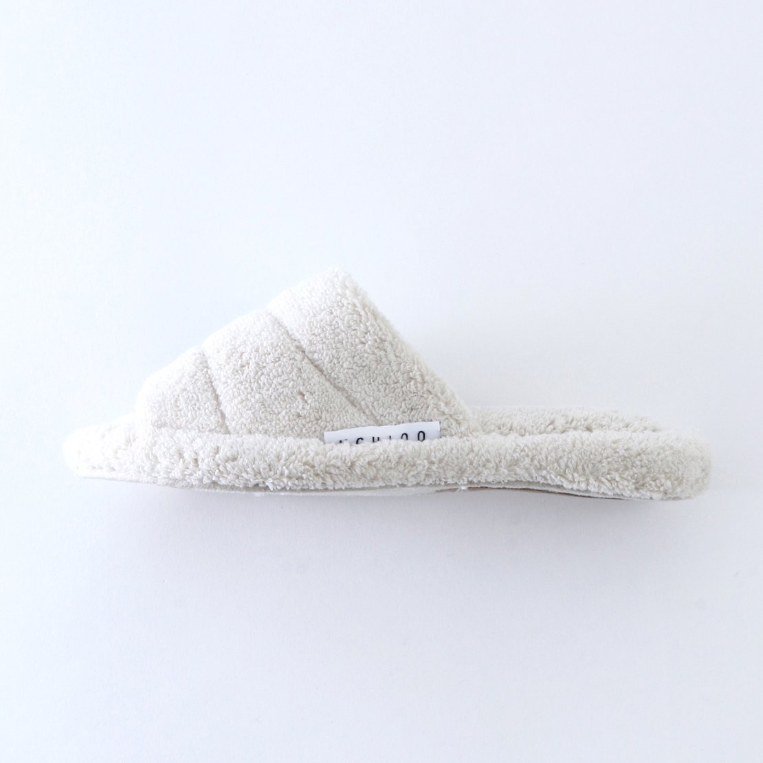 It is made of voluminous towel fabric that feels comfortable on bare feet. Since it is not a thong type, you can wear it even with socks on. The shoes are made of terry cloth and have a thick, sturdy heel that makes walking quieter.
