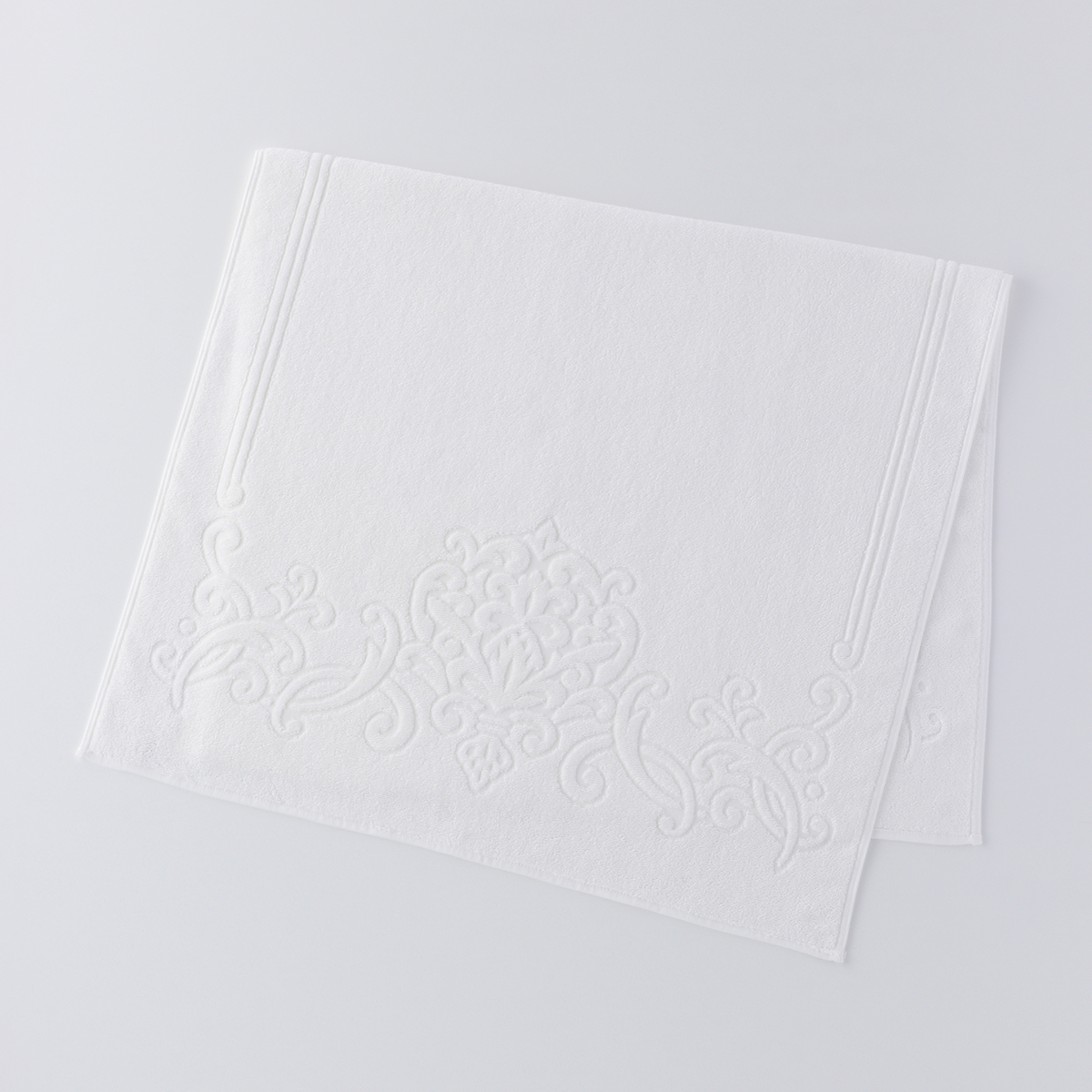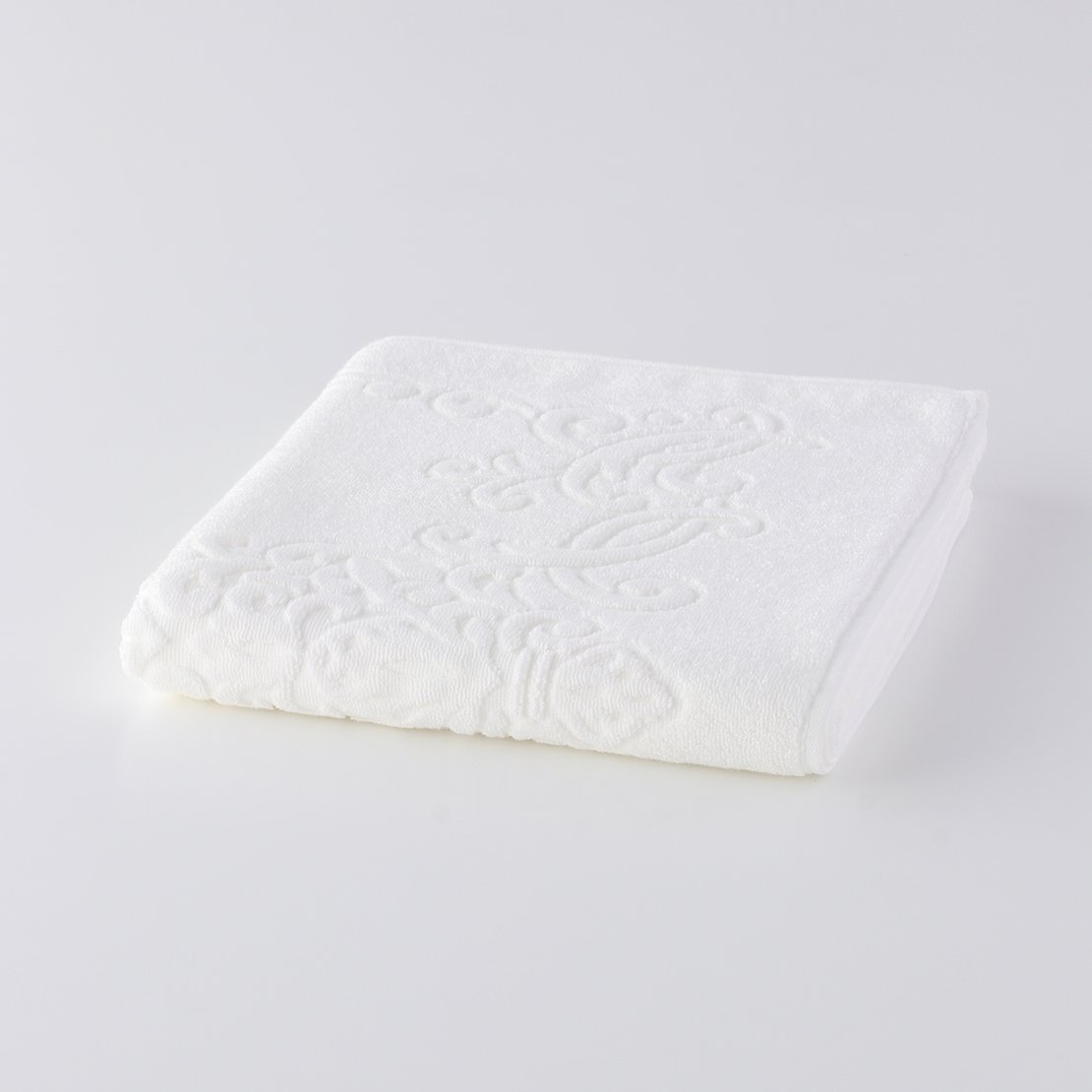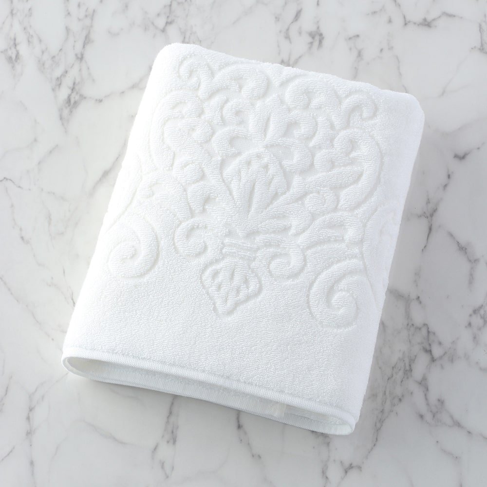 The world's finest cotton, "Sea Island Cotton," nicknamed the jewel of fibers, is used for the pile portion. The gorgeous medallion pattern is tightly woven with 50-count double-ply yarn. This towel has a smooth, glossy finish that is unique to Sea Island Cotton, which has long fibers. Its texture feels like high-class cashmere. Although it is cotton, it has a dazzling silk-like lustre.